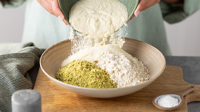 1 - Step 1: Put the pistachios and cardamom powder in the food processor and blend until finely ground. Transfer to a medium-sized bowl, add the almond meal, wheat semolina, baking powder and salt and mix well. Set aside.