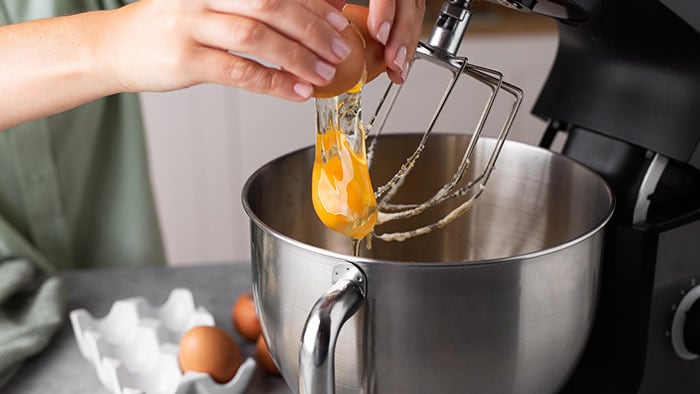 2 - Step 2: Add the softened butter and sugar to the bowl, attach the whisk and start the device on speed 3 for 2 minutes. Gradually add eggs one at a time and continue mixing on speed 8 for another 2 minutes until smooth and fully incorporated.